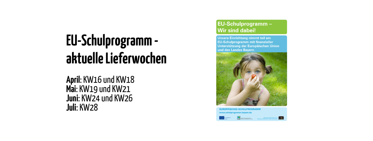 Wir beliefern Sie anhand der förderfähigen Menge und Anzahl der Portionen die pro Monat genehmigt werden, einsehbar unter https://www.stmelf.bayern.de/foerderung/schulprogramm/index.html. Die Anzahl der Lieferwochen werden jedoch sehr kurzfristig bekanntgegeben. Bitte beachten Sie, dass wir darauf keinen Einfluss haben.